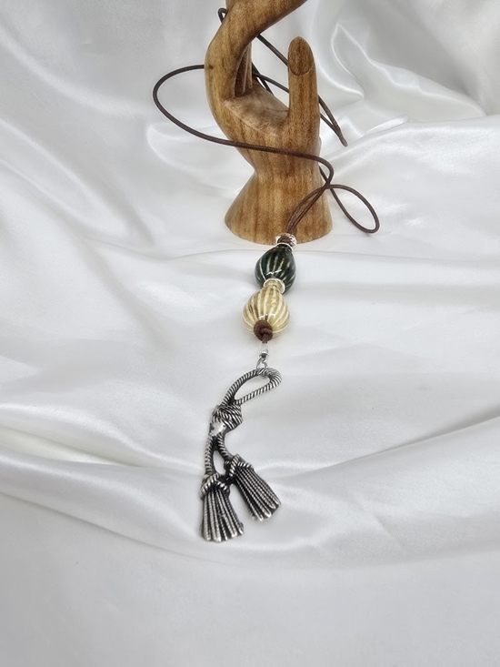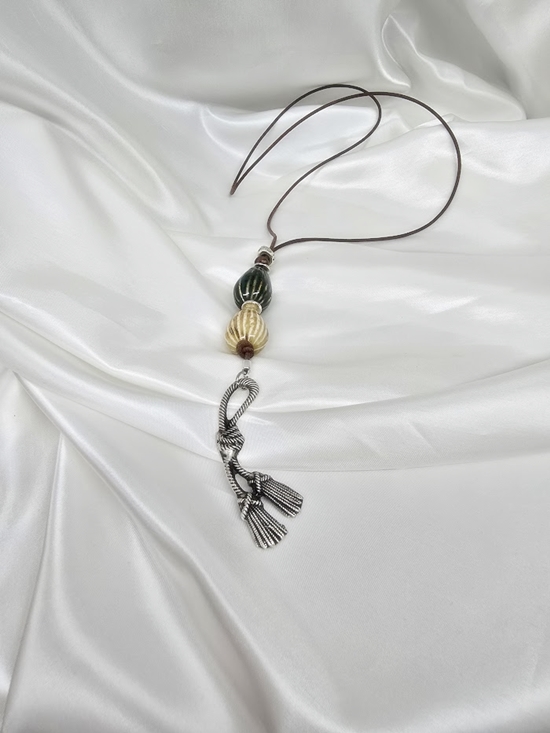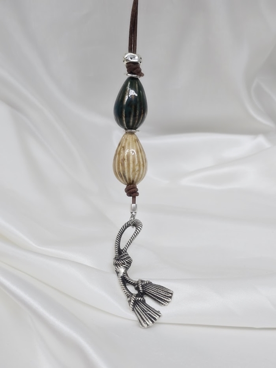 Un diseño elegante y original. Las piezas de cerámicas en tonos tierra y el cuero natural envejecido, se combinan con un lazo de zamak bañado en plata antigua que aporta estilo y personalidad.